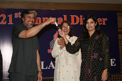 Mr. Sohail Afzal, Executive Director, Punjab Group of Colleges presenting key of the car to Ms. Afia Rafiq, 1st Position in LLB-III, University of the Punjab Annual Examination, 2008-09, at 21st Annual Dinner of Punjab Law College.